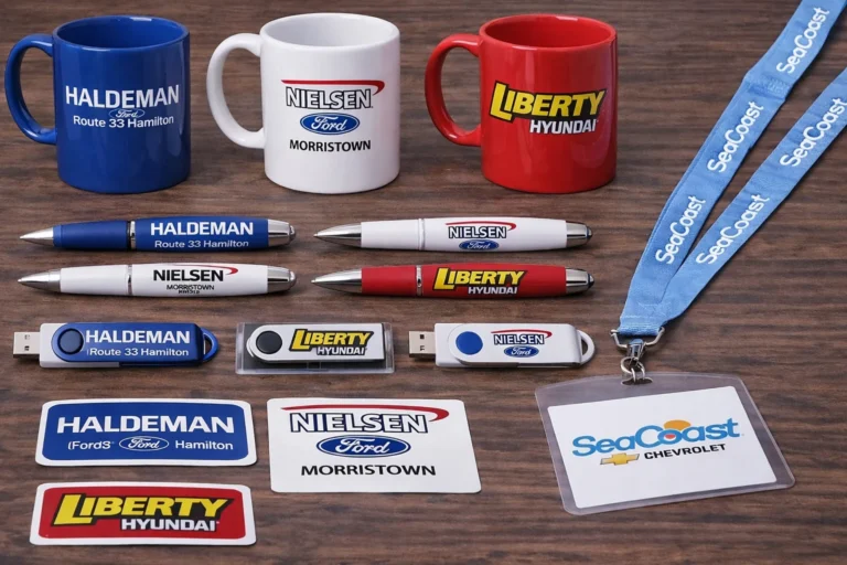 Stand out on the lot with promotional signage, window stickers, flags, branded merchandise, and more