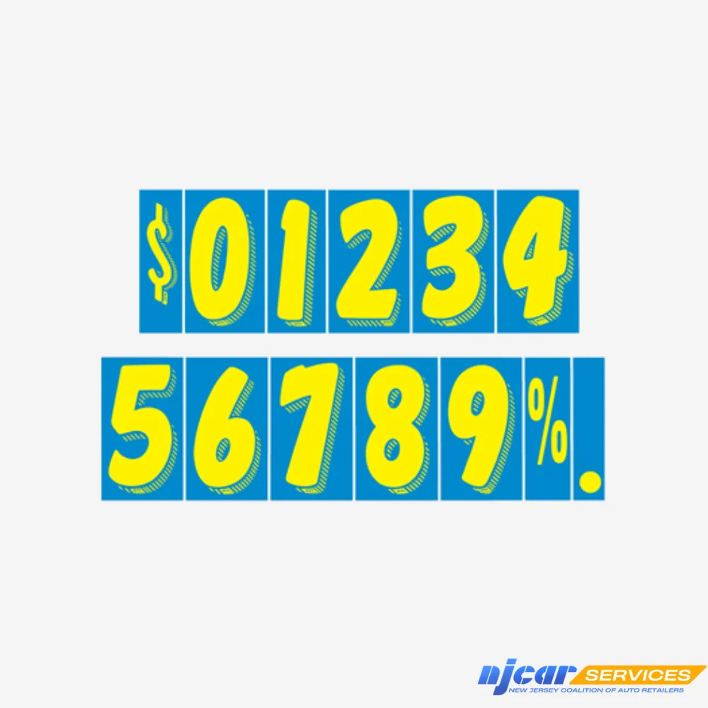 Bright Blue & Yellow, 3-D shaded design, adhesive windshield number.