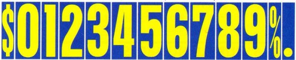 9 1/2″ tall x 4 3/4″ wide, yellow numbers, blue background, sold by dozen.