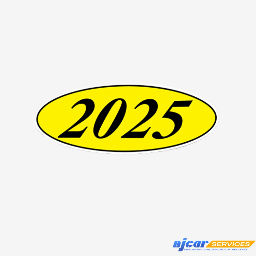 Black and Yellow oval, adhesive windshield year model sign. An inexpensive yet highly effective sales tool to advertise a year model. Sold by the dozen (12).