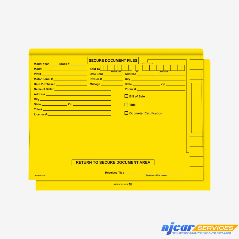 10-point colored Jacket is pre-printed with all of the pertinent information pertaining to the vehicle sale, plus lines for placing the Color-Code Labels on the side. Easy VIN and customer name identification makes this folder easy to file and easy to locate!