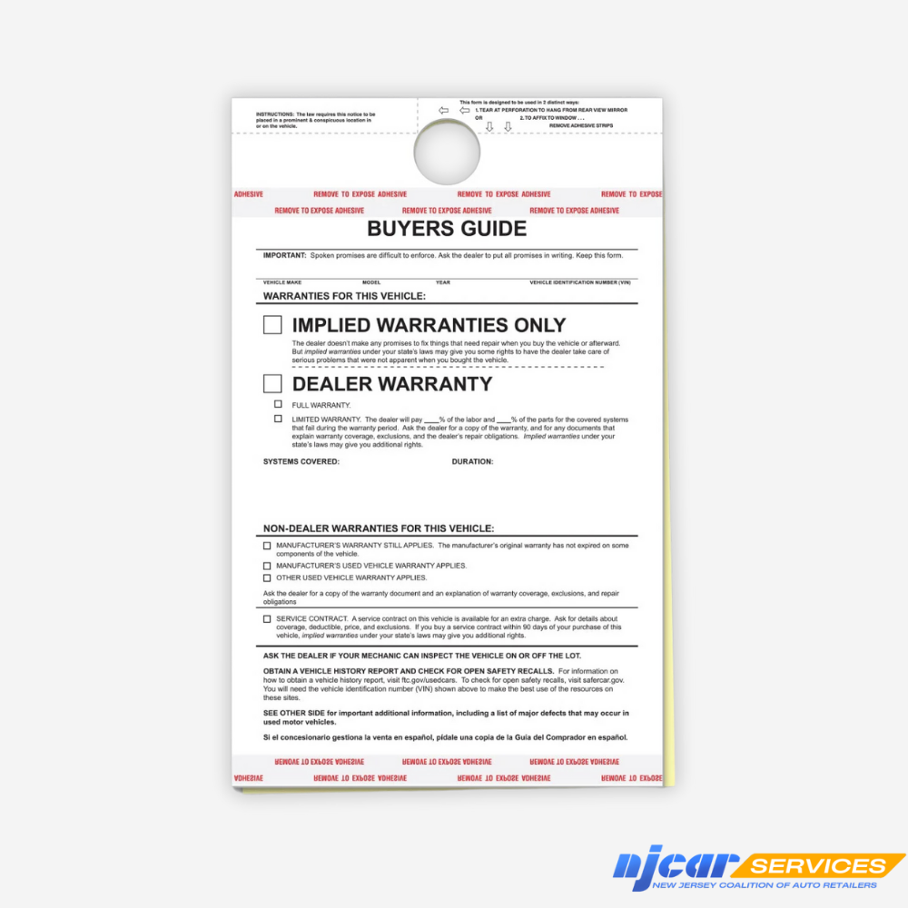 Designed to neatly hang from the rearview mirror, these guides can be temporarily removed for safer test drives. Great for vehicles with small side windows, like pickups. Double duty forms can be used two ways – adhesive strips allow form to be affixed to windows or hole allows form to hang from rearview mirror.