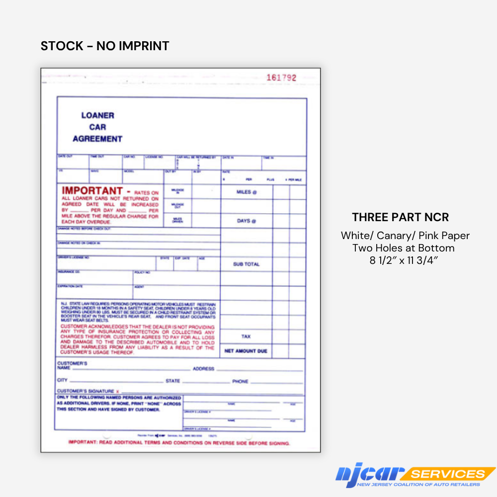 This stock version of the loaner agreement includes space for important customer and vehicle details. Printed in red and blue ink on NCR paper.