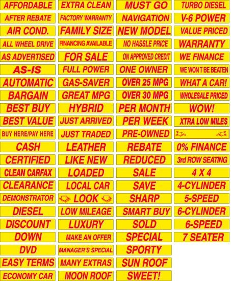 Description: 2 3/4″ high x 15″ long, red letters, yellow background, 60 slogans to choose from, sold by dozen. |