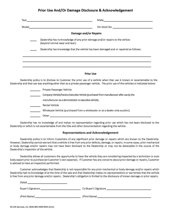 Prior Use And/Or Damage Disclosure & Acknowledgement quantity