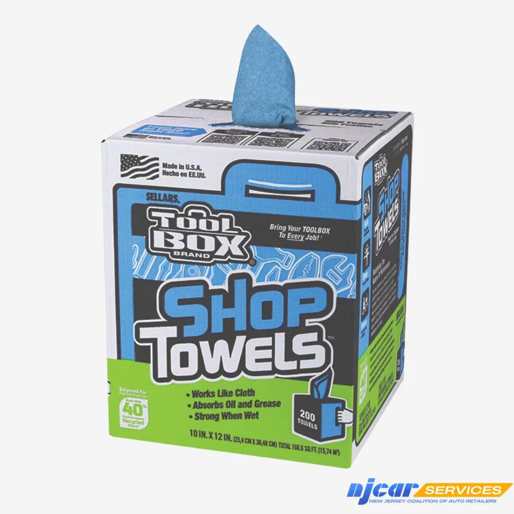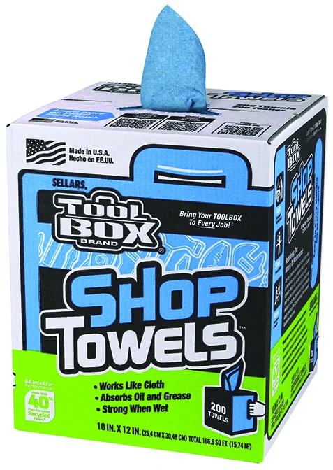 Shop Towels – Disposable. Blue in color – helps to hide grease & grime better for longer use. Works like cloth, soft on hands and face. Box has convenient carry handle.